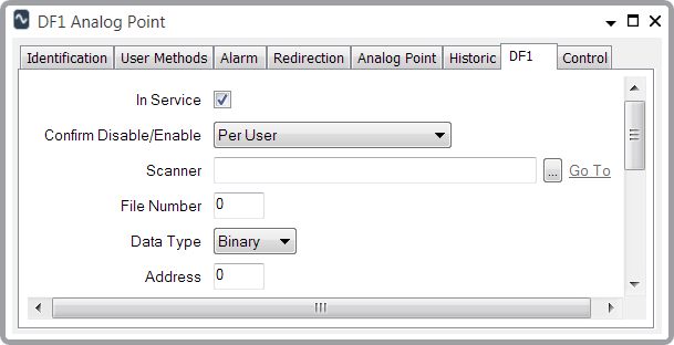 Use the fields at the top of the DF1 tab to configure the general point properties. The properties are common to points on the DF1 driver—for information, see Configure General Point Properties on the DF1 Tab.