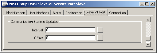 Use the fields within the Communication Statistic Updates section of the tab to define how often the communication statistics are updated for the Slave VT Port.