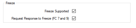 Use the fields within the Freeze section of the DNP3 tab to specify whether the outstation supports frozen counters, and whether Geo SCADA Expert requires a response to freeze counter requests.