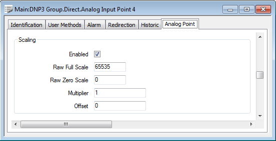 Use the Enabled check box to determine whether the driver scales the integer values that are reported by the outstation.