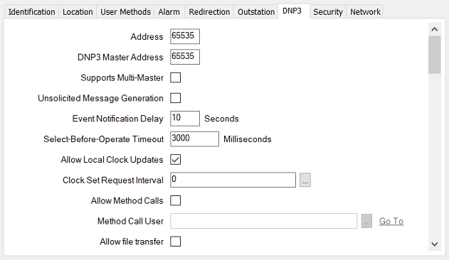- Allow Method Calls—If the DNP3 master is Geo SCADA Expert server, it can execute methods on items in the database of the Geo SCADA Expert server on which the Geo SCADA Expert slave outstation is located. Select this check box if you want a remote Geo SCADA Expert server to execute methods on items in the local database, via DNP3.