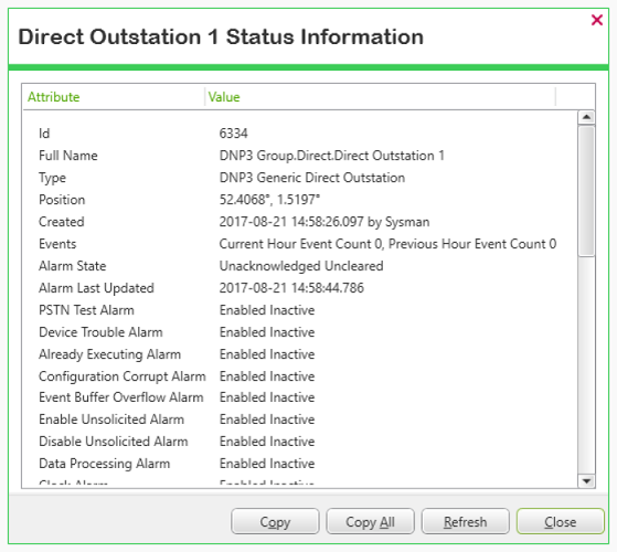 Every item in the Geo SCADA Expert database has its own Status display (also referred to as a View window or View dialog). You view an item's Status display by selecting that item's View Status pick action or menu option. The Status display provides information about the status of the selected item, presenting the information in the form of 'status attributes'. For further information about working with Status displays, see Status Displays.