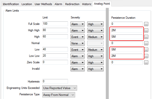 The relevant persistence time begins whenever the analog point’s value crosses a state limit.