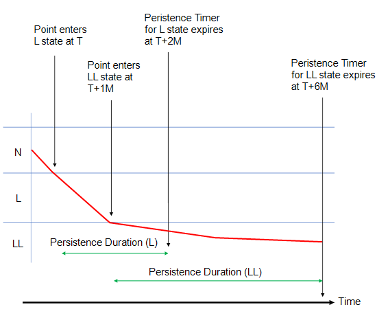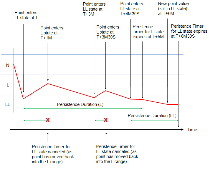 In the diagram below, L = Low, LL = Low Low, N = Normal state, and T = Time. When the point's value drops such that it enters the Low state, this triggers the Low state's persistence timer to start; this is configured with a Persistence Duration of 5M (5 minutes). After 2 minutes, the point's value drops further, such that it enters the Low Low state. The persistence timer for the Low state continues to run, but additionally the persistence timer for the Low Low state starts to run. This latter state has a Persistence Duration of 2M (2 minutes). As the point's value is still in the Low Low state 2 minutes later, when the Low Low state's persistence timer expires, the driver records the point as being in the Low Low state.