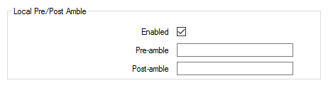 For information on the remainder of the fields in the Local Pre/Post Amble section, see Configure the Pre-Amble and Post-Amble Message Strings.