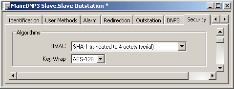 Use the fields within the Algorithms section of the Security tab to specify which HMAC and Key Wrap algorithms are used by this Slave outstation and its DNP3 master(s):