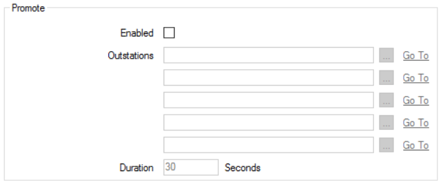 For output points that can be controlled by Geo SCADA Expert, use the fields within the Promote section of the Control tab to specify any outstations that will be issued with an integrity poll, as a result of a successful control request being sent to an outstation for a point. With Pulse Actions, the Promote section appears on the Pulse Action tab.