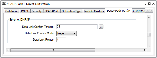 Use the fields in the Ethernet DNP/IP section of the SCADAPack TCP/IP tab to specify the DNP3 Data Link configuration for frames transmitted through either of the SCADAPack E outstation’s ethernet ports.
