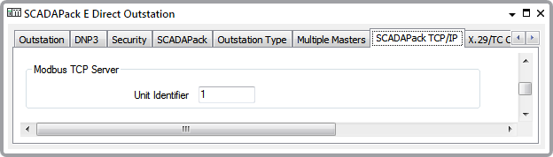 Use the Unit Identifier field within the Modbus TCP Server section of the SCADAPack TCP/IP tab to specify the Modbus/TCP Unit Address of the SCADAPack E outstation.