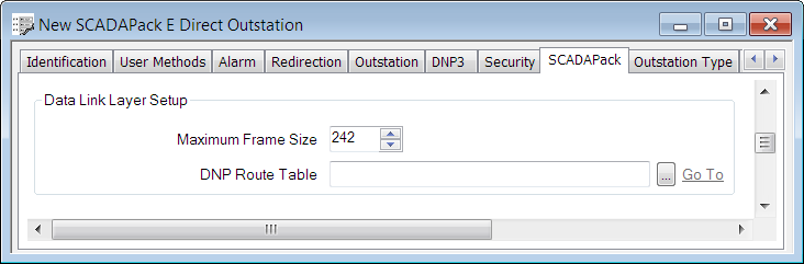 - Maximum Frame Size—(SCADAPack E Outstation firmware version 8 and later.) The SCADAPack E outstation sends and receives data in variable-size packets known as frames. Use this field to specify the maximum size of a single frame sent by the outstation. In environments with high levels of interference, reducing the maximum frame size may alleviate communications problems. See Define the Maximum Size of Data Packets.