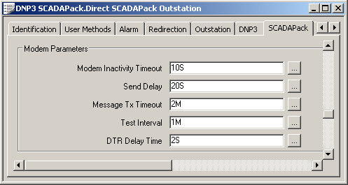 Use the fields within the Modem Parameters section on the SCADAPack tab to specify the modem properties if the SCADAPack E outstation is to communicate with any device—not just Geo SCADA Expert—using a dial-up modem. Specify each value in the OPC Time Format.