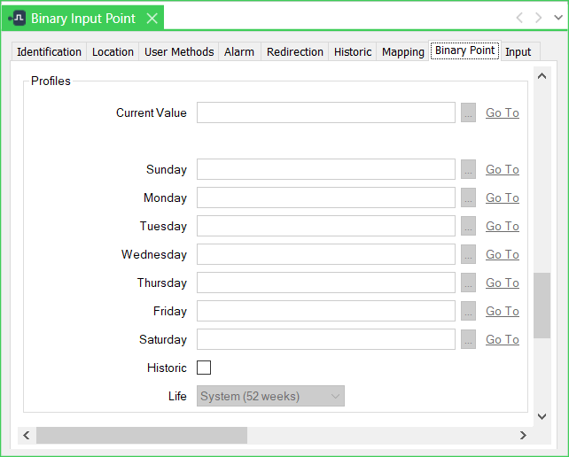 Use the fields within the Profiles section of the Binary Point tab to specify whether any Profiles are used to control the point’s current value, depending on the time of day or week.