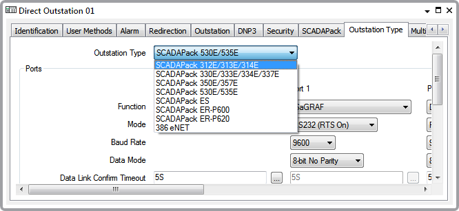 Use the combo box at the top of the Outstation Type tab to specify the type of outstation that this DNP3 SCADAPack E Outstation database item represents.