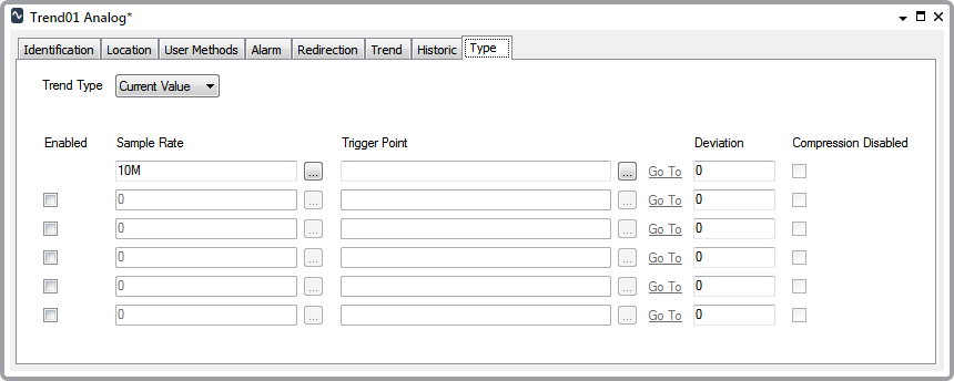 When the Trend Type is set to Current Value, the outstation can perform up to six separate sampling tasks on the point’s data. For the outstation to perform more than one sampling routine, select the Enabled check box for each additional sampling routine that is required.