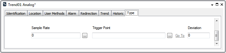 - Deviation—Only applicable when the Trend’s Parent Point is an analog or counter point. Optionally specify a Deviation greater than zero if the outstation is only to store the sampled value if it differs from the previously stored sampled value by at least the Deviation amount.