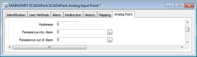 The Persistence into/out of Alarm properties are only relevant if the point has a Point Data Class of Class n Event (see Configure Common Properties of DNP3 SCADAPack Points).