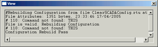 The figure below shows the configuration log file (config.log) for a successful configuration download where the configuration file included entries that the SCADAPack E outstation could not interpret. The configuration log file indicates the line number (110 in this example) in which the unknown entry occurs.