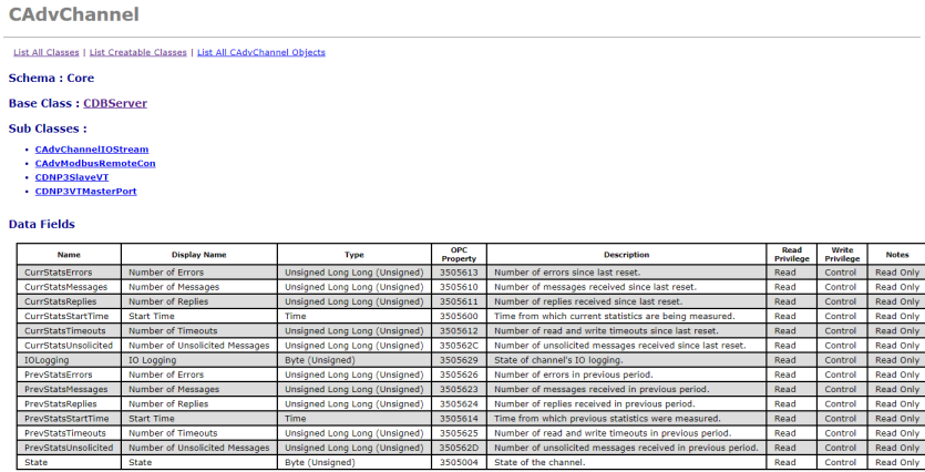 - OPC Property—Each field is allocated an OPC property that is shown as a hexadecimal number. The properties are either standard OPC properties or vendor specific properties allocated by Schneider Electric. They are used as identifiers and are required by some third-party OPC applications.