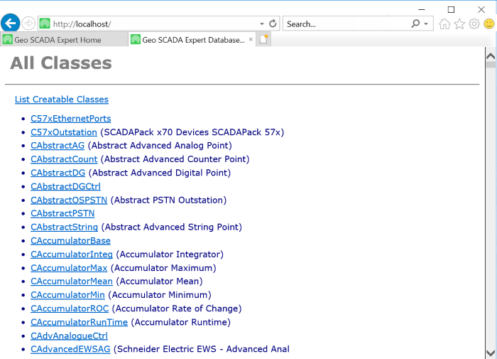 You can use the Geo SCADA Expert Database Schema to display information about every class, not just those classes that are creatable. By displaying the All Classes 'page', you can: