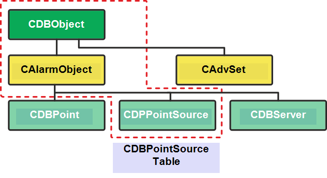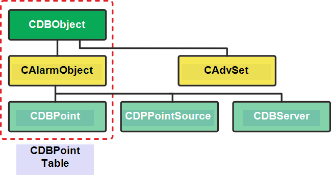 The diagram below shows the CDBObject class and some of its sub-classes (CAlarmObject, CAdvSet). It also shows some of the sub-classes of the CAlarmObject class (CDBPoint, CDBPointSource, and CDBServer).
