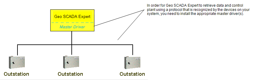 With most Geo SCADA Expert drivers, Geo SCADA Expert is the SCADA Master. With such a setup, the Geo SCADA Expert serverretrieves the data from its outstations, PLCs and other devices using the appropriate protocol.