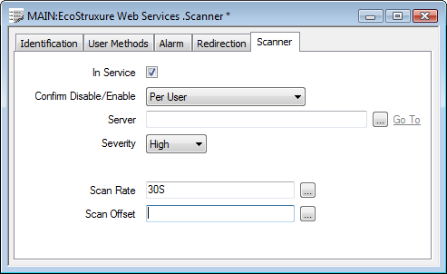 Use the fields on the Scanner tab to define the driver-specific properties of a scanner. Some of these fields are common to many scanners (see Configuring Scanners on Simple Drivers in the Geo SCADA Expert Guide to Simple Drivers). Those fields that are specific to scanners on the EWS Client Driver are described below.