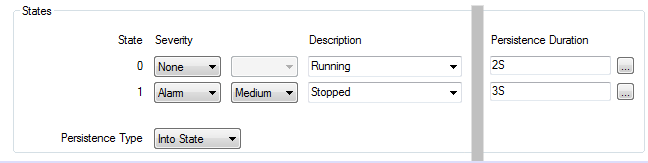 As such, when the point changes from ‘Running’ to ‘Stopped’, three seconds has to elapse before the value and state are recorded as having changed (as the point’s Persistence Type is configured as ‘Into State’, with a Persistence Duration of 3S (3 seconds) for the ‘Stopped’ state). If, during this three-second period, the value changes back, the fleeting change in value and state are not logged.