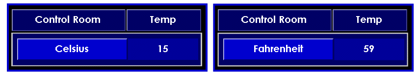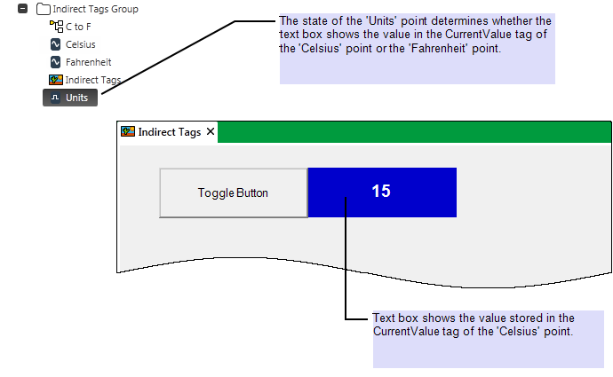 A Mimic contains a text box that displays the temperature of the control room. There is a button on the Mimic that toggles the text box so that it displays the value for the 'Celsius' point or the value for the 'Fahrenheit' point. This is achieved by using an indirect tag in an animation. The indirect tag allows the text box to show the CurrentValue property, but for different points.