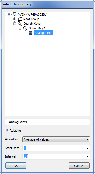 When you select a search key in the Select Historic Tag window, you can define which historic values you want to use, and what calculation you want Geo SCADA Expert to perform on them. To do this, you can use the Algorithm field to choose the type of calculation, the Start Date to define the earliest value you want to use and the Interval to define the entire range of historic values to be used. For example, if you select a search key named HisAVE and select Average of Values for the Algorithm, H as the Start Date and 1H as the Interval, the expression will return the average value of the item that has HisAVE as its value for the search key. The average value will be calculated using the historic values from the start of the current hour up to the end of the current hour.