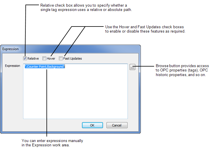 Some check boxes are specific to the type of item you are configuring. The Expression window for Mimics provides a Hover check box and a Fast Updates check box that are not shown on the standard Expression window.