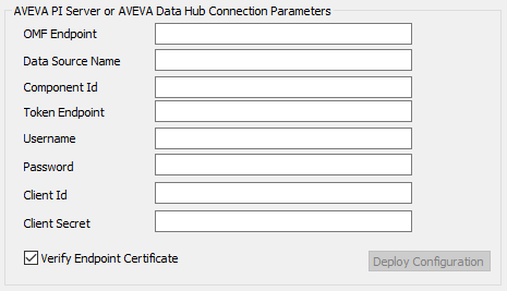 OMF Endpoint—Enter the URL of the historian endpoint (the AVEVA PI Web API or AVEVA Data Hub). The endpoint must be an Open Message Format (OMF) endpoint. The URL comprises an http or https endpoint string.