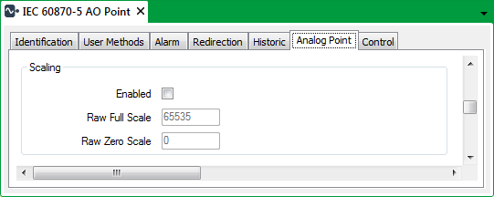 - Enabled—Select this check box if the input value at the outstation needs scaling for use in Geo SCADA Expert, and vice versa for output values. The IEC 60870-5 driver performs the required scaling before passing the value onto Geo SCADA Expert.
