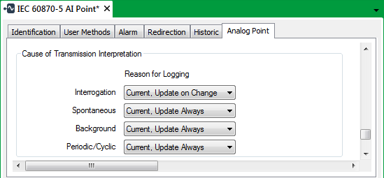 Use the fields within the Cause of Transmission Interpretation section on the <Point Type> tab to specify how Geo SCADA Expert is to handle point data that it receives with each ‘Cause of Transmission’ indicator. By default, Geo SCADA Expert points are configured to process the values that are returned by an outstation as current data. However, if you only require the data sent with certain ‘Cause of Transmission’ indicator(s) to be stored historically, you will need to specify different options. To do this, you will need to use the fields in the Historic Data Filter section to Specify the Type of Point Data that Geo SCADA Expert is to Store Historically.).