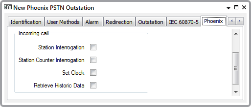 Use the check boxes within the Incoming Call section of the Phoenix tab to specify which operations Geo SCADA Expert is to perform whenever it is contacted by this particular outstation: