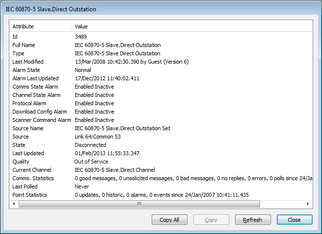 The Status display for each IEC 60870-5 Slave Direct Outstation provides information about the present state of the individual outstation.