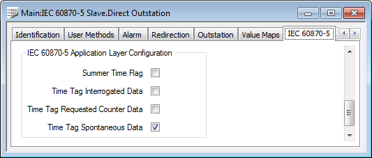 The configuration Form for IEC 60870-5 Slave Direct Outstations and IEC 60870-5 Slave Logical Outstations includes an IEC 60807-5 Application Layer Configuration section. Use the section to specify whether the slave outstation (Geo SCADA Expert) reports its summer time setting or includes time stamps with the data that it sends to its SCADA master (Controlling Station).