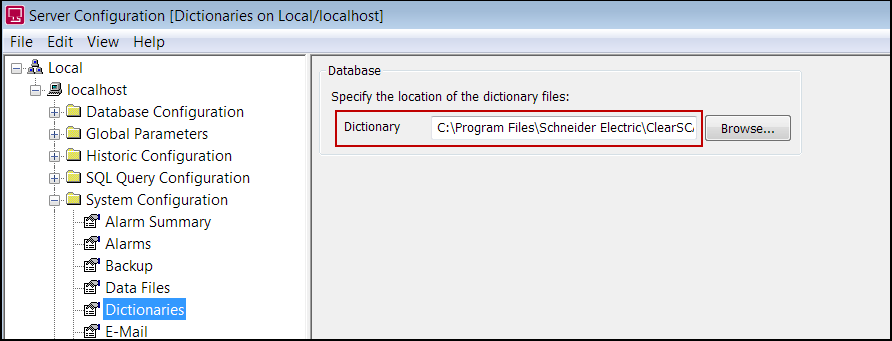 2. Navigate to the folder where you store your File Translation Dictionary files. The default folder is: C:/Program Files/Schneider Electric/Geo SCADA Expert. However, it might be another folder on your computer. If you are not sure which folder the files are stored in, you can find out by using the Geo SCADA Expert Server Configuration tool. To do this, expand the System Configuration branch in the tool and then select the Dictionaries branch. The folder location appears in the Dictionary field in the Database section.