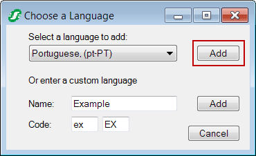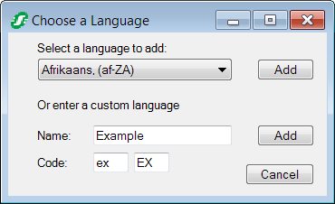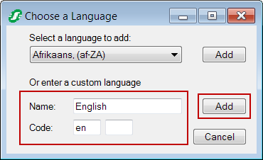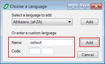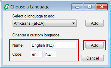- Code:—Enter the language code then select the Add button next to the Code field. For a country-specific language, the code will have the form <language>-<REGION>, with the region in upper case. For example: en-NZ for English (New Zealand). In this case, you would enter 'en' in the first Code field and 'NZ' in the second Code field. You must use ISO standard 639-1 and 3166 naming conventions.