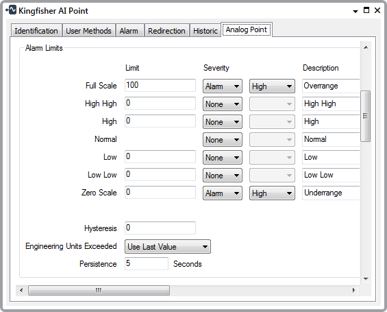 Use the fields within the Alarm Limits section of the Analog Point tab to set limits for a point and specify whether an alarm or event is generated if the point exceeds those limits.