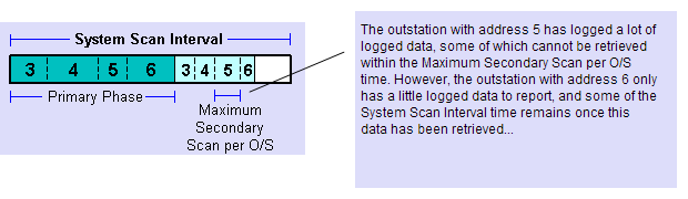 If there is still time remaining before the System Scan time expires, then outstations that still have secondary data available can be re-visited for a period limited by the Maximum Secondary Scan per O/S interval as many times as necessary until the System Scan time expires.