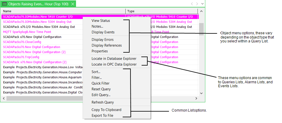 For information on the type of context-sensitive menu options that are available on Alarms Lists, see Alarms Lists in the Geo SCADA Expert Guide to Alarms.