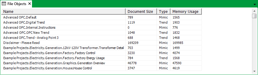 • Use the File Objects List to view information about 'file' objects, such as Mimics, Trends, X-Y Plots, X-Y-Z Plots, and Dynagraphs.