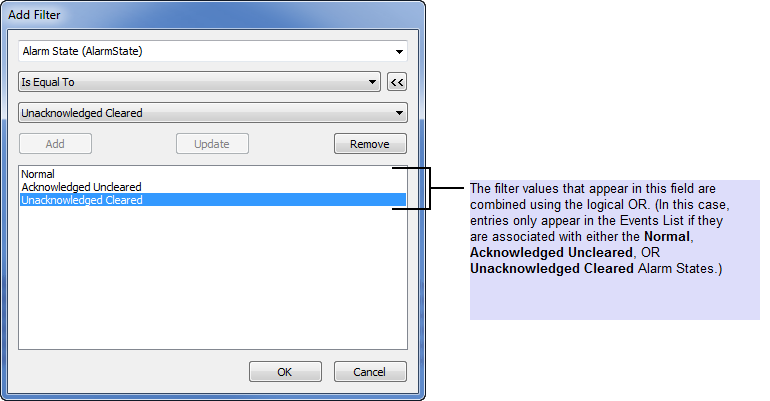 If you choose to filter the entries in an Events List by the Alarm State (AlarmState) field, and select the Is Equal To filter condition, you can add multiple alarm states to that field’s filter values list.
