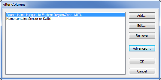 The Display Points option is used to display a Queries List of the points that are associated with a particular outstation. The Filter option is used to display the Filter Columns window. A further filter is added to restrict the List to only those points that contain the word ‘Sensor’ within their name.