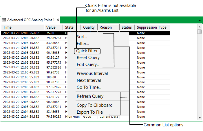 With Alarms Lists, Events Lists, and Queries Lists, the following options might also be available: