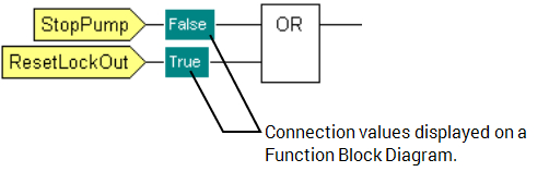 When you display a Function Block Diagram in Run mode, you can view the values at each stage of the diagram. For example, if you were interested in the value that is coming from an input variable, you can display the value on the connection line between the input variable and the Logic item to which it connects.