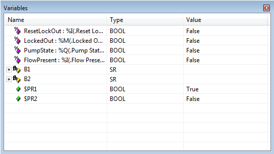 The Variables window contains expandable lists of the variables in your Sequential Function Chart. For each variable, it lists the Name of the variable, the Type (which shows the data type), and the Value (which shows the current value of the variable).