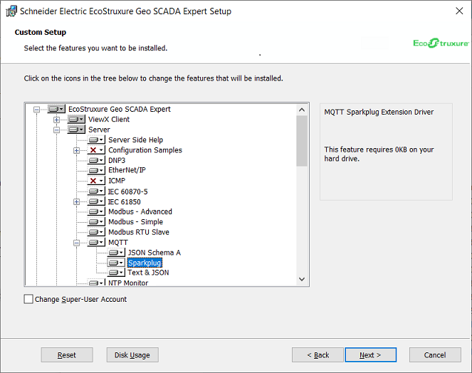 The Sparkplug component is located in the Server group, in a branch off from its MQTT ‘parent’ driver component. To check that this component has been installed, ensure that the symbol to the left of the text Sparkplug does not have an X on it.