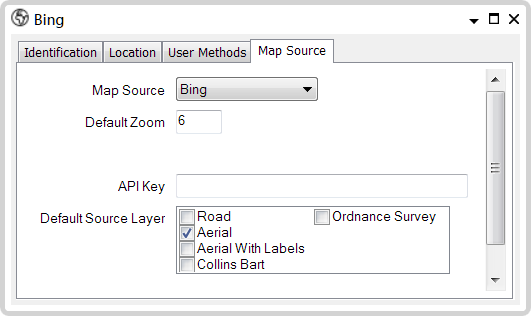 - Map Source—Use this combo box to enter the type of this Map Source. In this case, you would select the Bing option. You can then specify a base layer map from the available Bing Maps options (see Default Source Layer below).