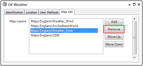 To remove a Map Source from a Map Set: In the Map Layers field, select the Map Source that you want to remove and then select the Remove button.